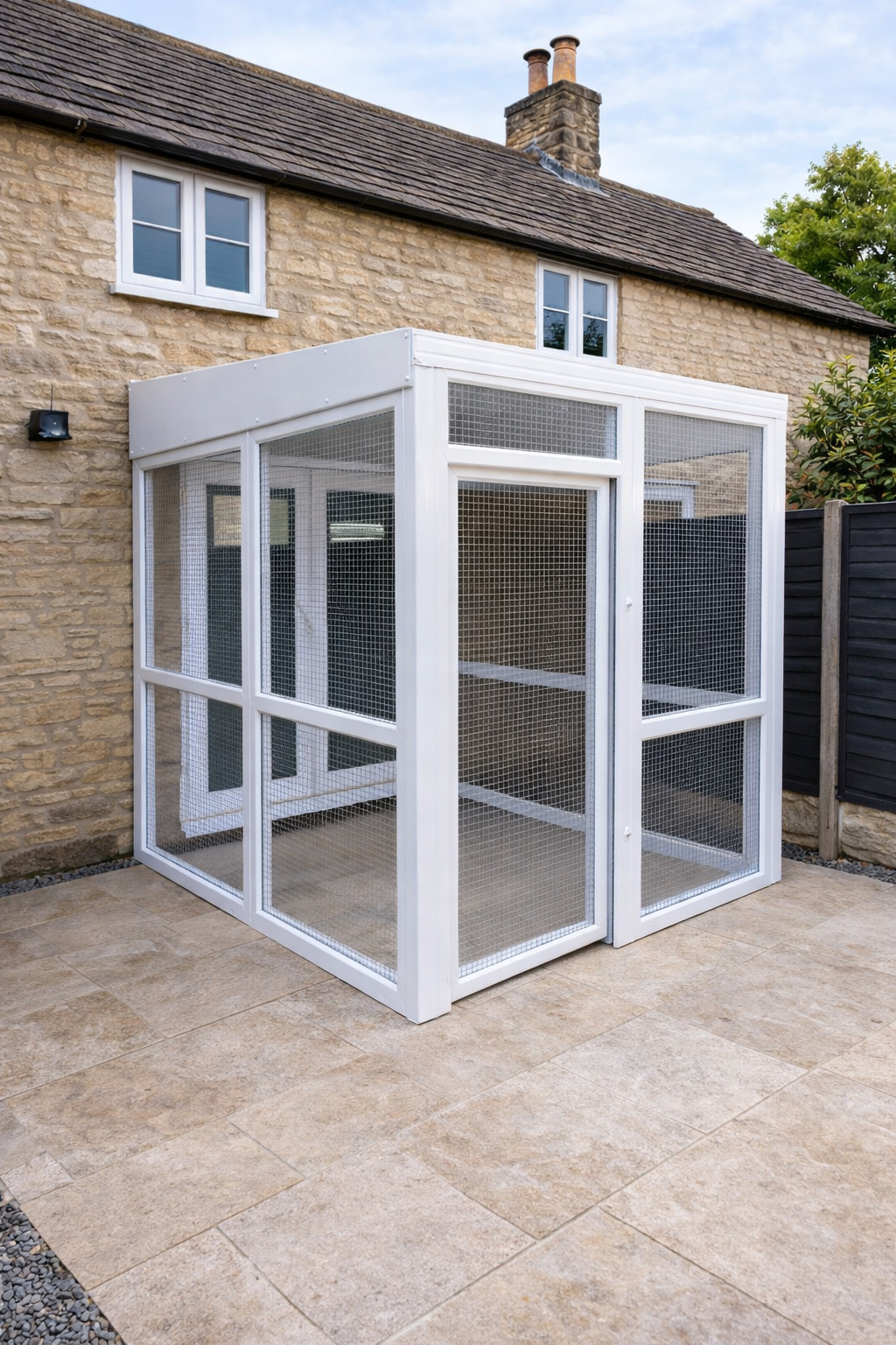 Traditional domestic Catio Enclosures are constructed with a thin metal or wood frame and fabric or ‘chicken wire’ steel wire mesh…